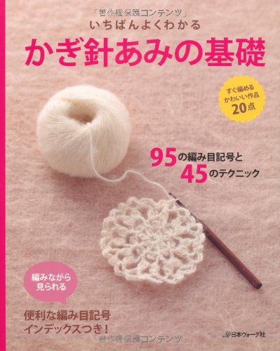 初めてかぎ針編みに挑戦する方に、圧倒的におすすめしたいのがこちらの本です。日本ヴォーグ社から出版されているこのシリーズは、編み物初心者のために作られた超定番の教科書的存在。
